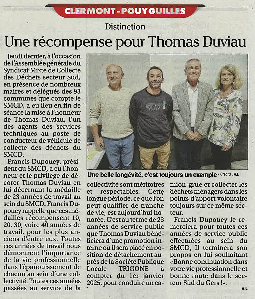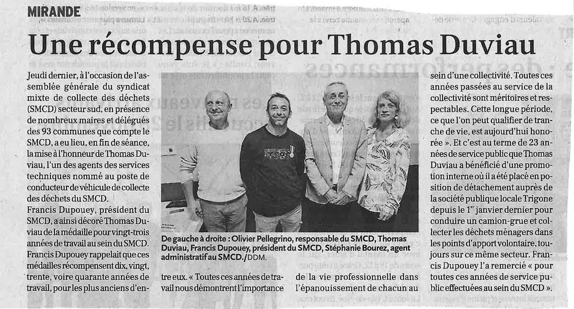 A l’occasion de la dernière assemblée générale, Francis DUPOUEY, Président du SMCD du secteur SUD, a remis jeudi 25 septembre 2025 la médaille d’argent à Thomas DUVIAU.