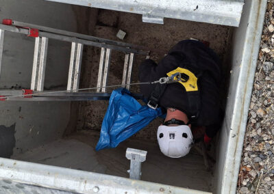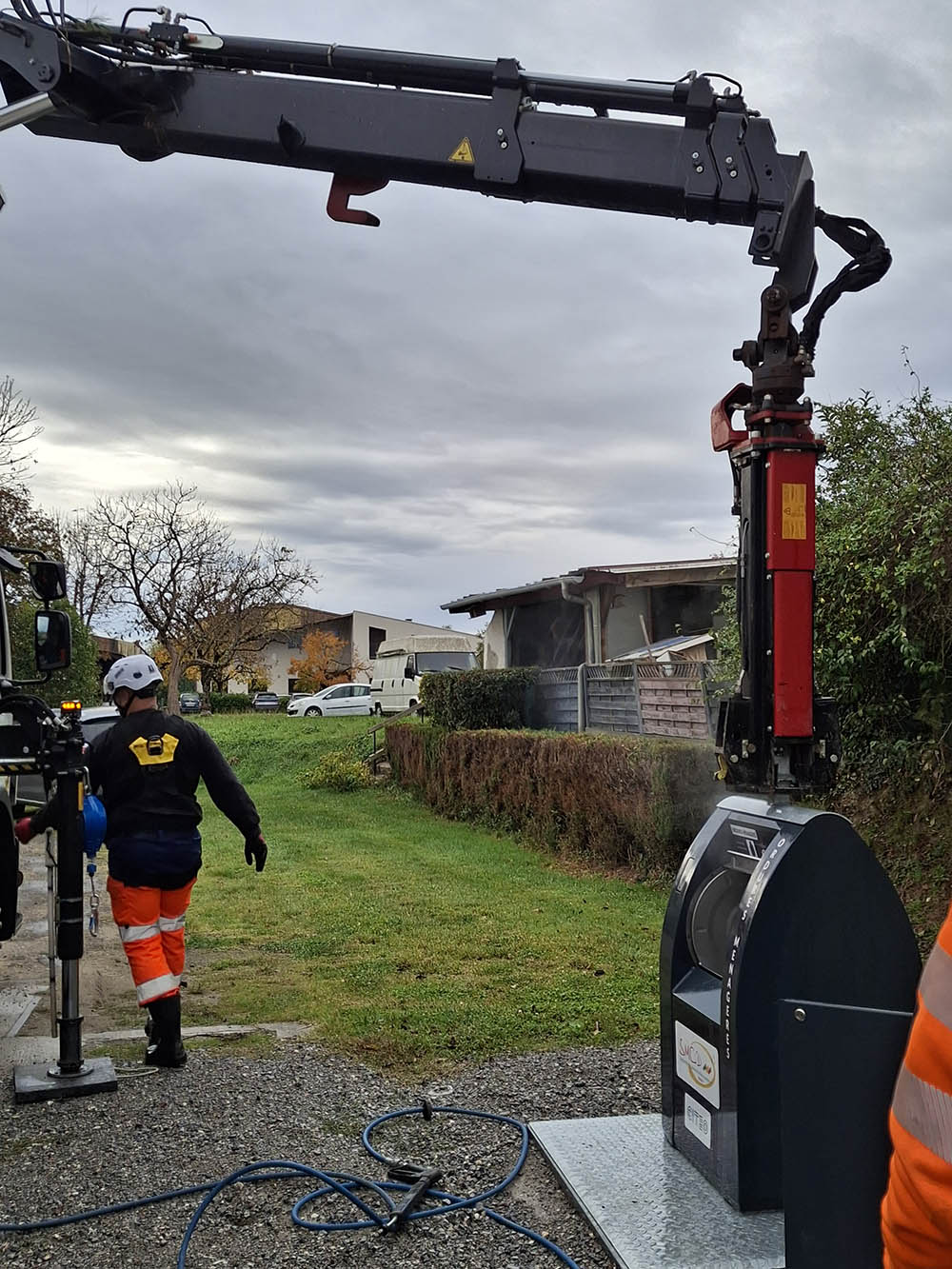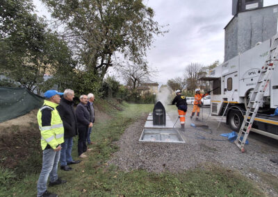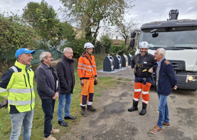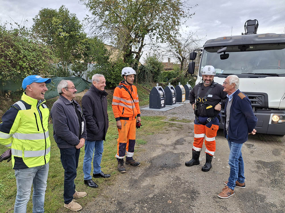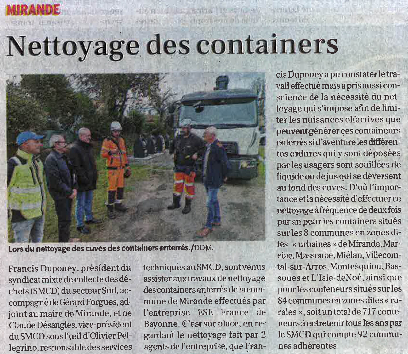 Francis DUPOUEY, président du syndicat mixte de collecte des déchets (SMCD) du secteur SUD, accompagné de Gérard Forgues, adjoint au maire de Mirande, et de Claude Désangles, vice-président du SMCD sous l’oeil d’Olivier Pellegrino, responsable des services techniques au SMCD, sont venus assister aux travaux de nettoyage des containers enterrés de la commune de Mirande effectués par l’entreprise ESE France de Bayonne…